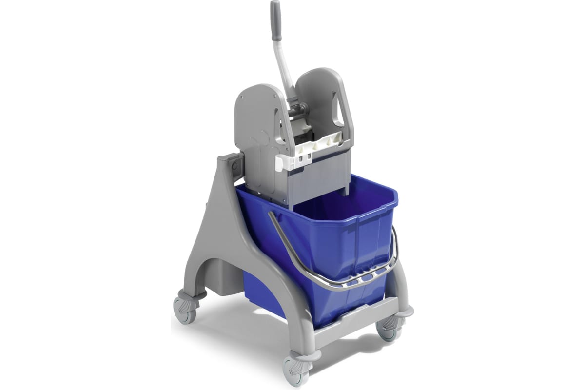 Эта тележка с одним синим ведром объемом 25 л, укомплектованная удобным рычажным отжимом для мопов, изготовлена целиком из полипропилена, позволяющего легко очищать ее и допускающего переработку.