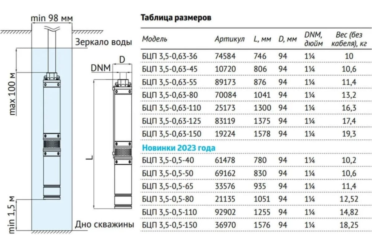 Погружной центробежный электронасос Unipump БЦП 3,5-0,63-150 2200 Вт, 1 м 19224 служит для подачи пресной чистой воды из колодцев, скважин и открытых водоёмов.
