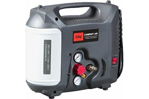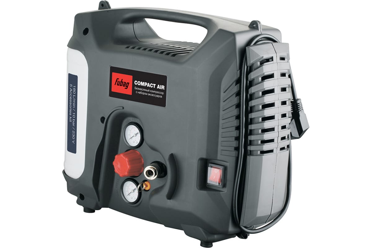 Компрессор FUBAG Compact Air + набор из 5 предметов 6412320 - компактный безмасляный компрессор с ресивером 5 литров и набором из пяти предметов. Легко справится с накачкой колес, мячей и матрасов, а также продувкой компьютеров, фильтров и радиаторов.