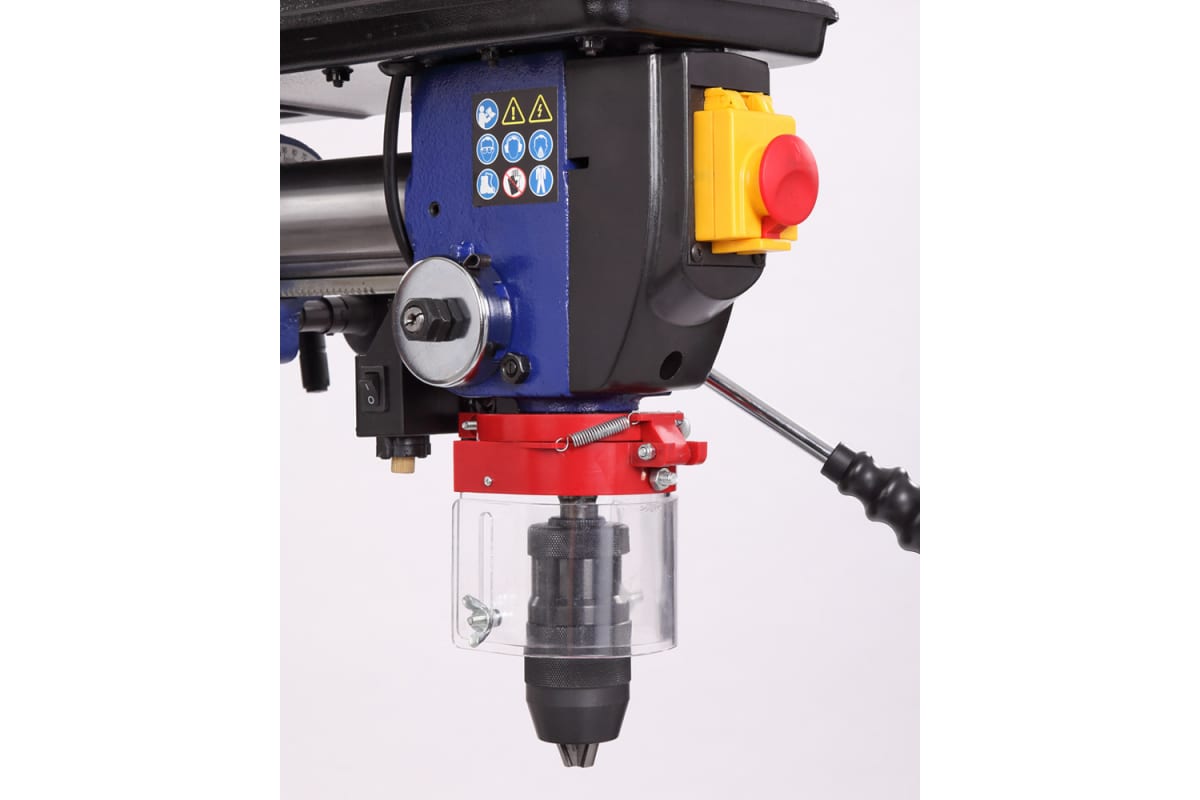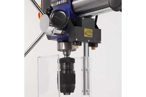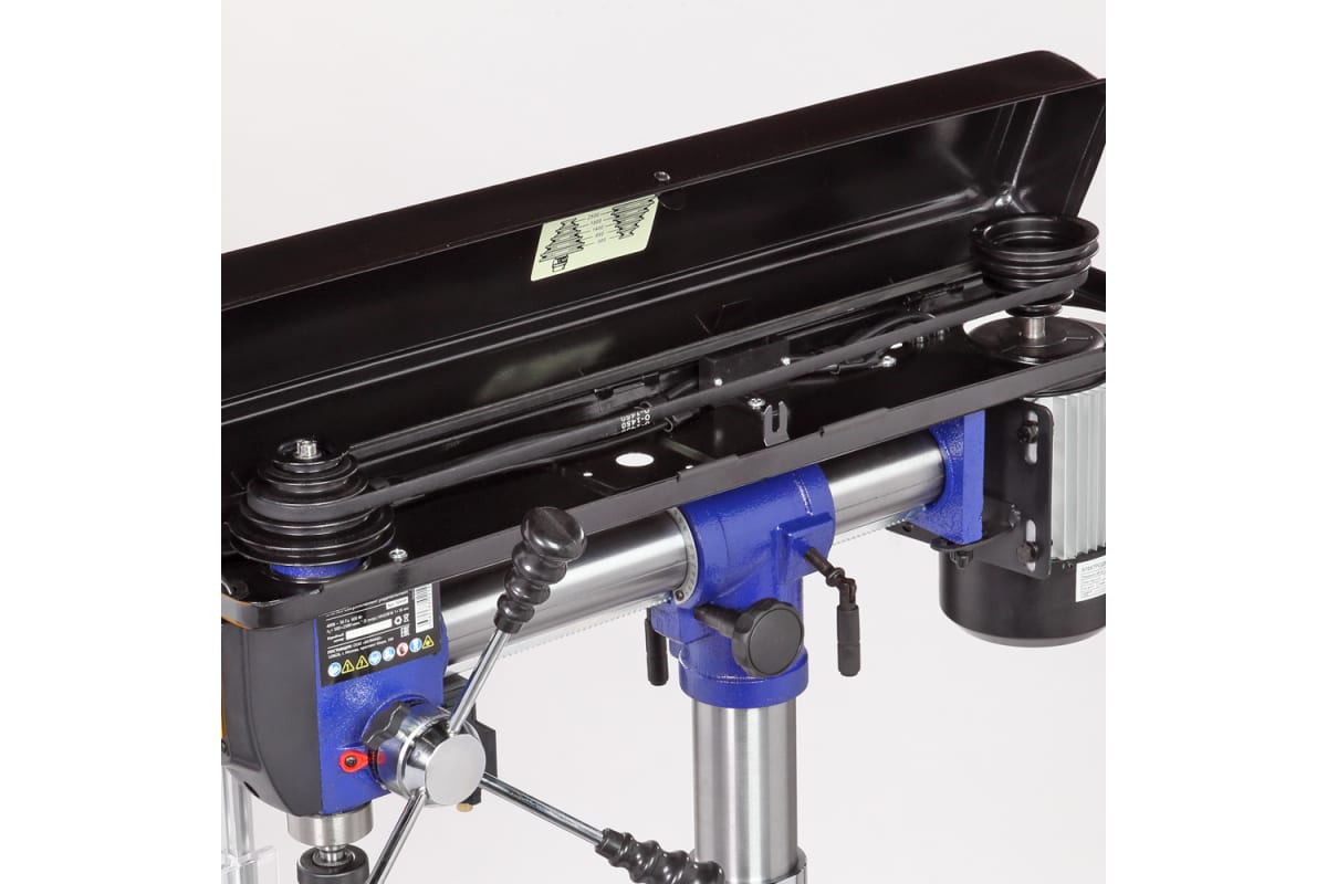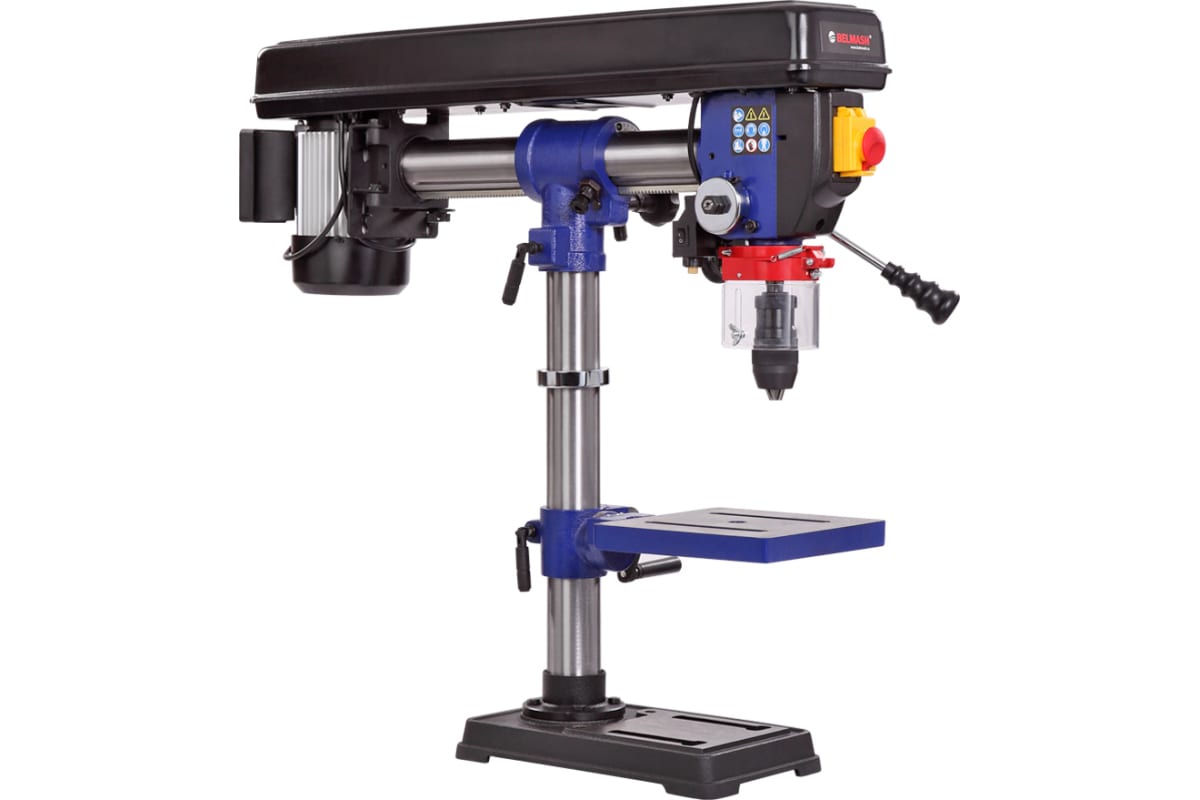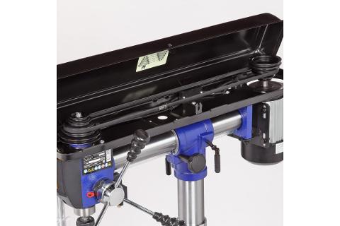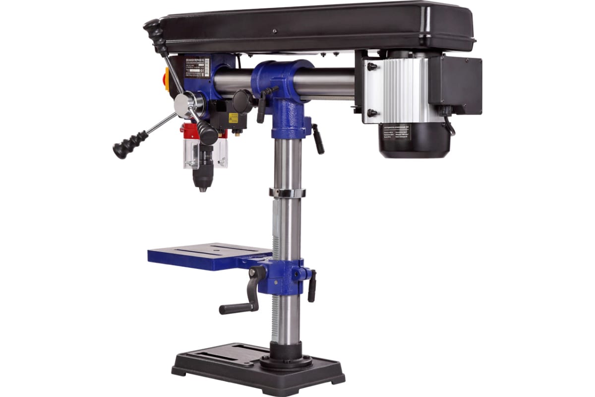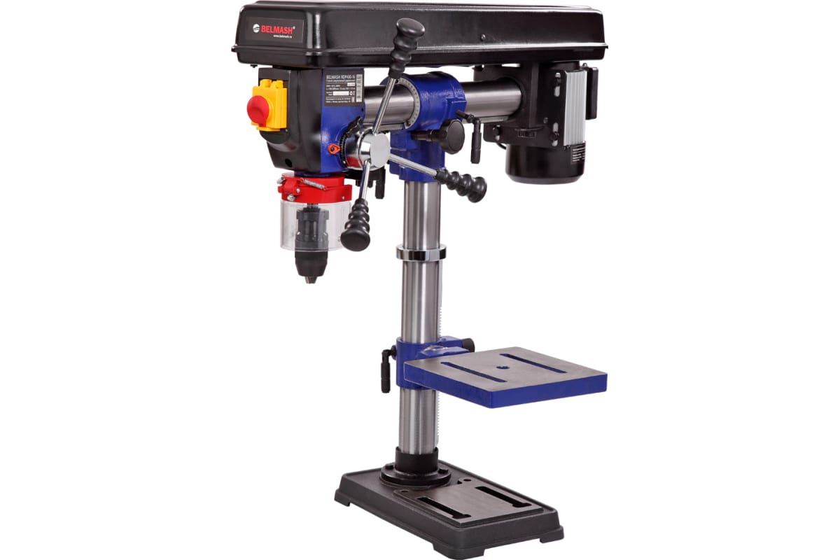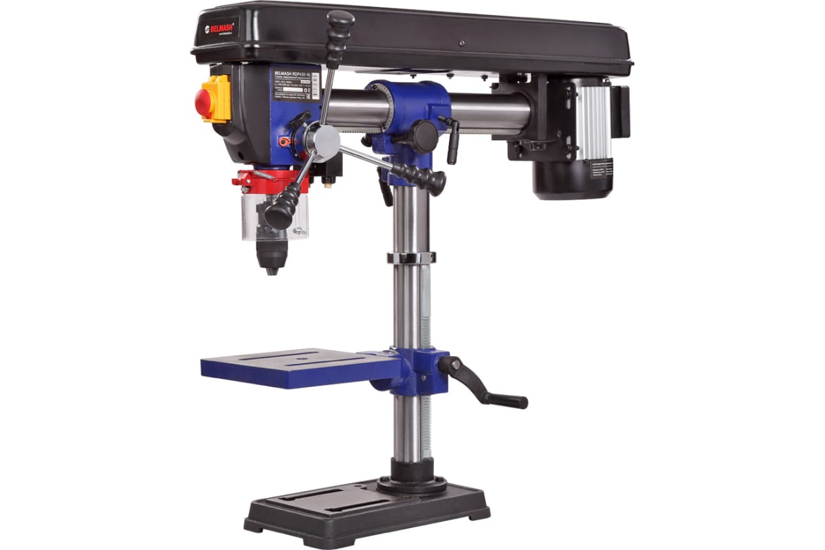 Станок предназначен для обработки различных материалов вращающимся режущим или шлифующим инструментом, с целью получения сквозных или глухих отверстий, растачивания, зенкерования. Модель является радиальной, то есть возможны поворот сверлильной головки относительно вертикальной оси (360 град.), наклон относительно горизонтальной оси (45 град. вправо, 90 град. влево) и есть ход по горизонтали. Стол, опора и корпус сверлильной головки выполнены из чугуна. На основании имеется два отверстия для дополнительной фиксации станка. Двигатель асинхронный, мощностью 600 Вт. Станок рассчитан на подключение к трехфазной сети 400 В. Имеется пять скоростей шпинделя (от 500 до 2500 об/мин), что необходимо при выполнении различных операций и для разных материалов. Переключение происходит за счет переброски ремня. Для этого необходимо открыть крышку ременного отсека, ослабить барашек крепления двигателя, тем самым получив возможность смещения шкива, перекинуть ремень и проделать операцию в обратной последовательности.