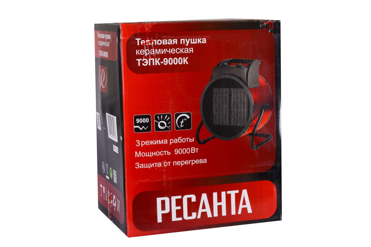 Преимущества Ресанта ТЭПК-9000К: надежность и эффективность нагревательных элементов даже при максимальной нагрузке; наличие защиты от перегрева (термозащита); минимальный уровень шума; высокая скорость набора заданной температуры; экономичность расхода электроэнергии; функция автоподдержания заданной температуры при помощи терморегулятора; возможность использовать прибор на полную (9 кВт) или половинную мощность (6 кВт), а также в качестве вентилятора без нагревания (80 Вт).