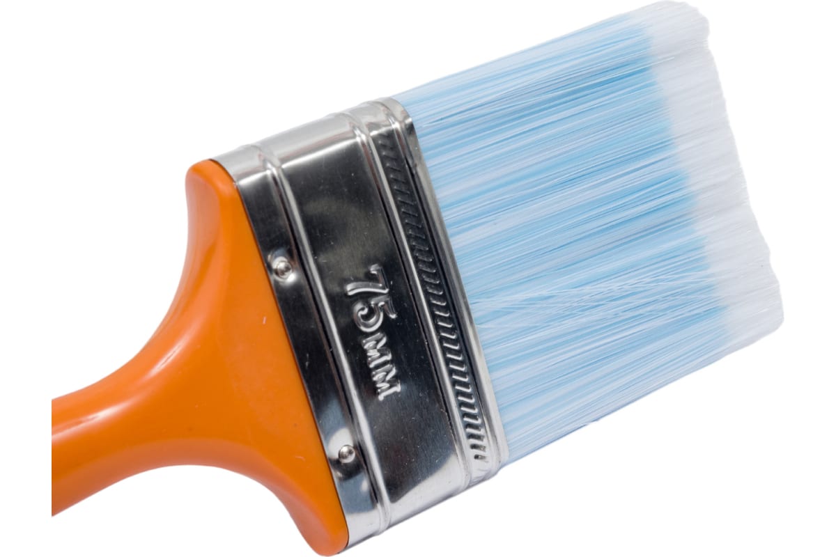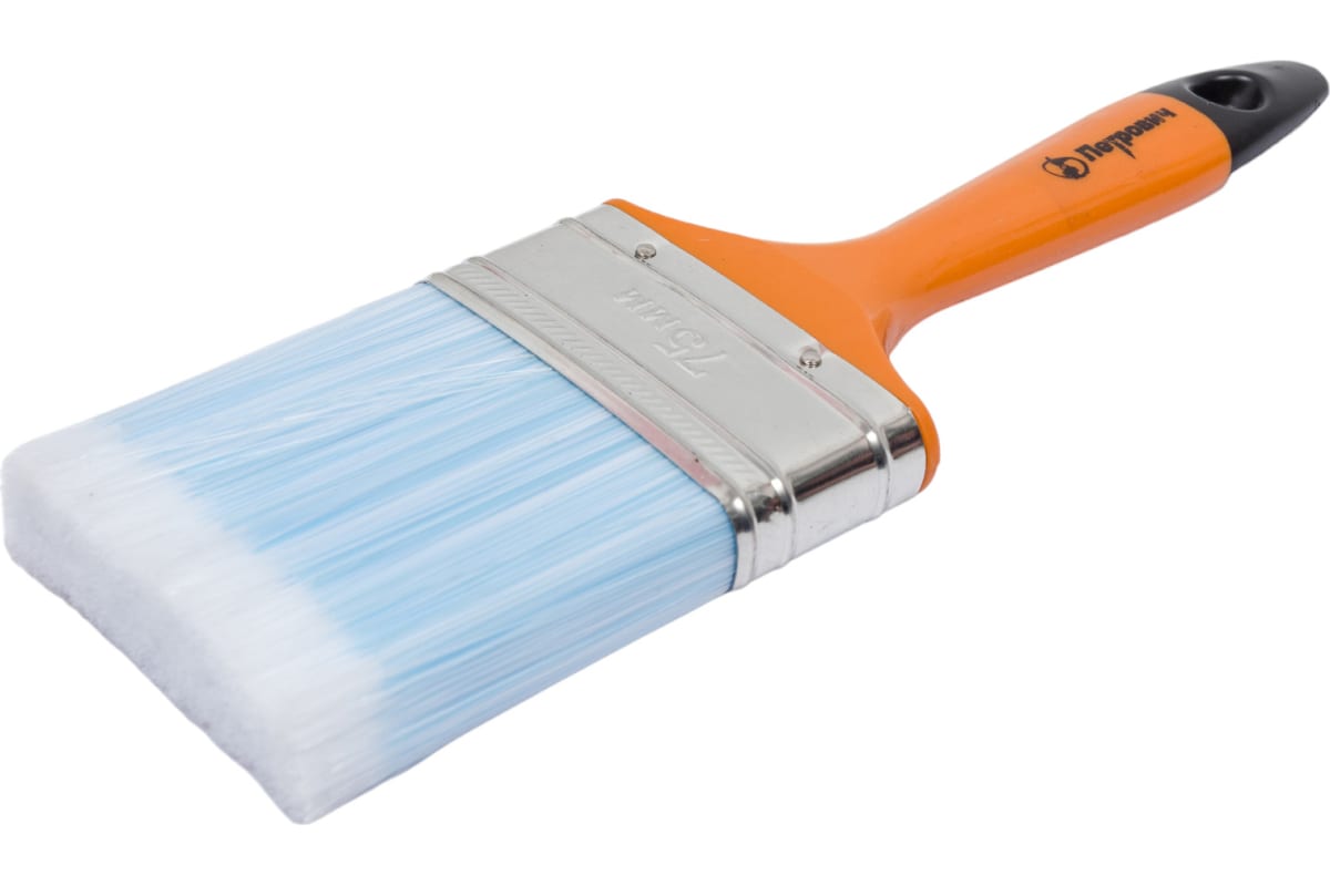 Плоская кисть Петрович 75 мм, искусственная щетина, пластиковая рукоятка 4100002402 предназначена для окрашивания поверхностей акриловыми и водно-дисперсионными ЛКМ.
