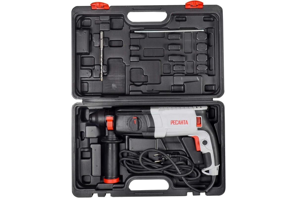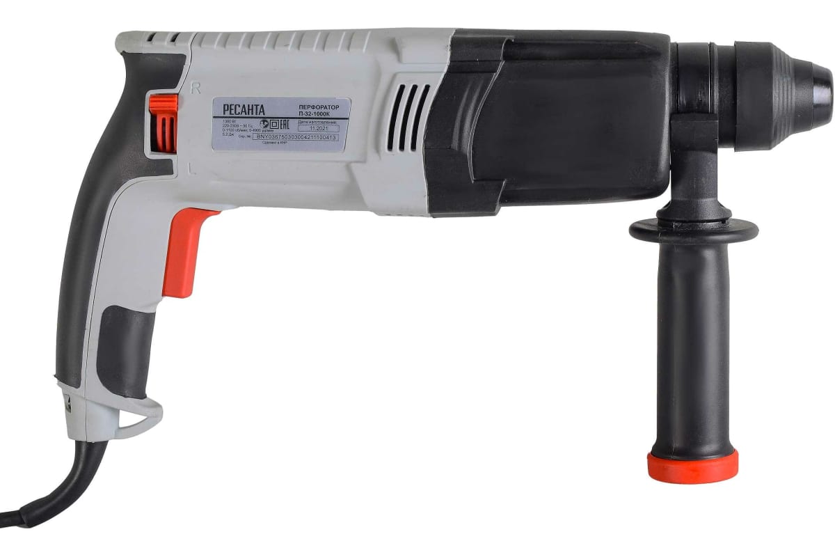 Перфоратор модели Ресанта П-32-1000К оснащён электродвигателем мощностью 1000 Вт, имеет 3 режима работы: режим сверления, режим сверления с ударом, режим удара. Энергия удара составляет 5,2 Дж. Частота вращения регулируемая и составляет от 0 до 1100 об/мин. Частота ударов – 0-4900 уд/мин. Максимальный диаметр сверления в древесине – до 40 мм, в бетоне – до 32 мм, в стали – до 13 мм. Блокировка кнопки включения исключает случайный запуск электродвигателя. Имеется возможность регулировки углового положения перфоратора. Устройство оснащено кабелем 2-метровой длины и дополнительной ручкой с резиновым покрытием. Питание инструмента – от сети 220В, 50Гц. Вес – 3.4 кг.
