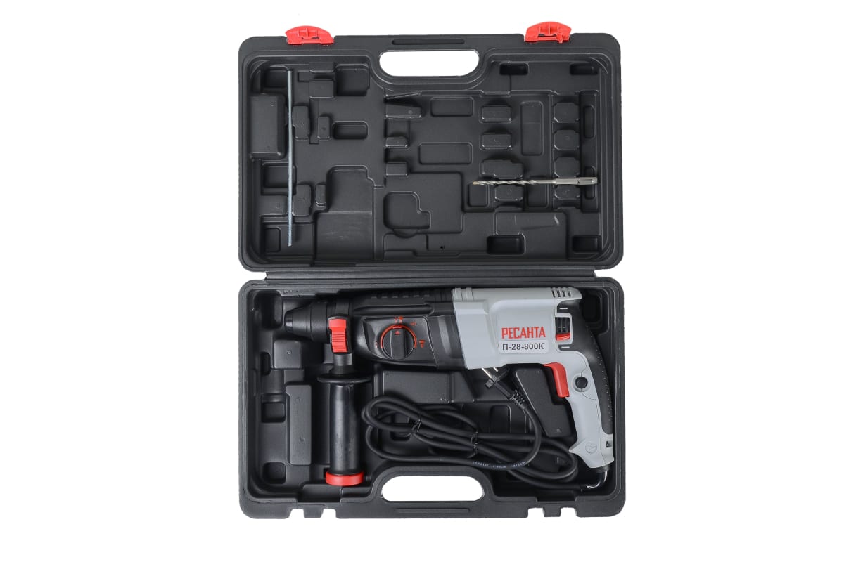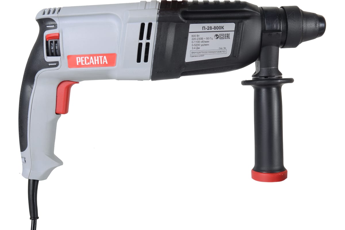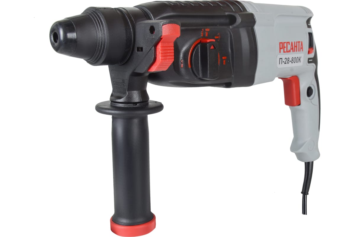 Электрический перфоратор Ресанта П-28-800К мощностью 800 Вт используется для сверления твердых материалов, таких как бетон, камень и кирпич. Частота вращения сверла 0-1100 об/мин регулируется в зависимости от плотности рабочей поверхности. Инструмент имеет 3 режима работы: сверление, сверление с ударом и функция удара с частотой 0-5200 уд/мин. Энергия удара - 3.4 Дж достаточно для продолжительной сложной работы. Хвостовик патрона типа SDS-plus обеспечивает быструю и удобную замену оснастки. Максимальный диаметр отверстий для металла 13 мм, для бетона - 28 мм, для дерева - 40 мм.