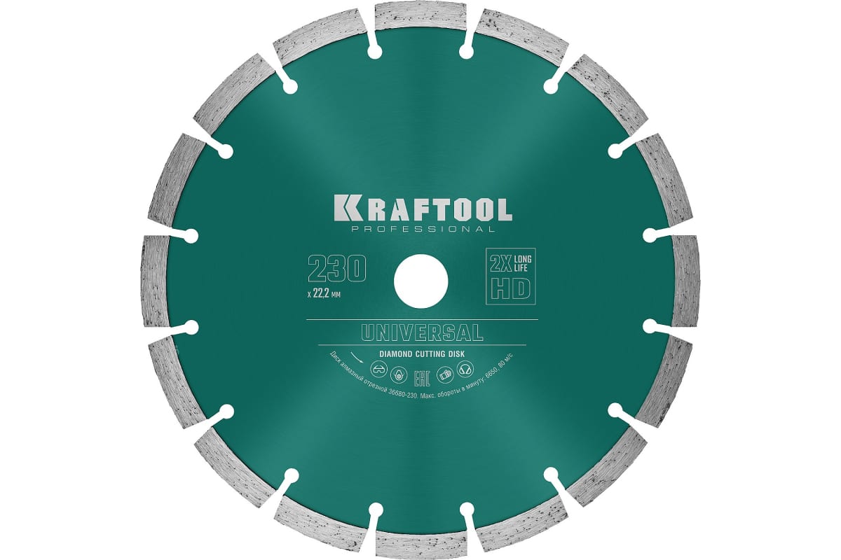 Диск алмазный сегментный Universal KRAFTOOL 36680-230 предназначен для резки бетона и железобетона с помощью угловой шлифовальной машины.