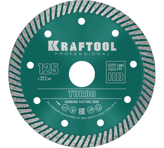 Диск алмазный отрезной турбо Turbo KRAFTOOL 36682-125 предназначен для резки бетона и кирпича с помощью угловой шлифовальной машины.