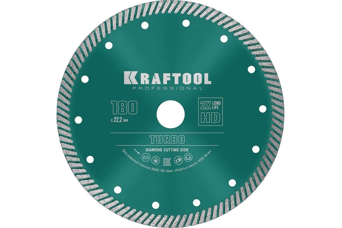 Диск алмазный отрезной турбо Turbo KRAFTOOL 36682-180 предназначен для резки бетона и кирпича с помощью угловой шлифовальной машины.