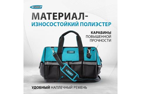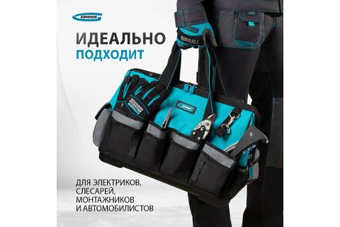Сумка для инструмента Gross Handwerker 90273 габаритами 475 х 260 х 360 мм, с 42 карманами, пластиковым дном и наплечным ремнем, будет полезна слесарям, монтажникам, электрикам, а также автомобилистам. В основном отделении, внутренних и внешних карманах поместятся все необходимые инструменты.
