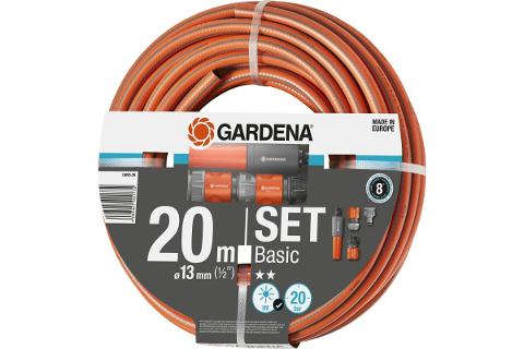 В готовый к использованию комплект входит базовый шланг длиной 20 м диаметром 1/2 дюйма (13 мм), соединитель для крана с переходником, подходящим для водопроводных кранов диаметром 21 мм (G 1/2 дюйма) и 26,5 мм. (G 3/4"), базовый соединитель для шланга, базовый водяной стопор, а также базовая насадка.