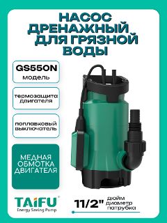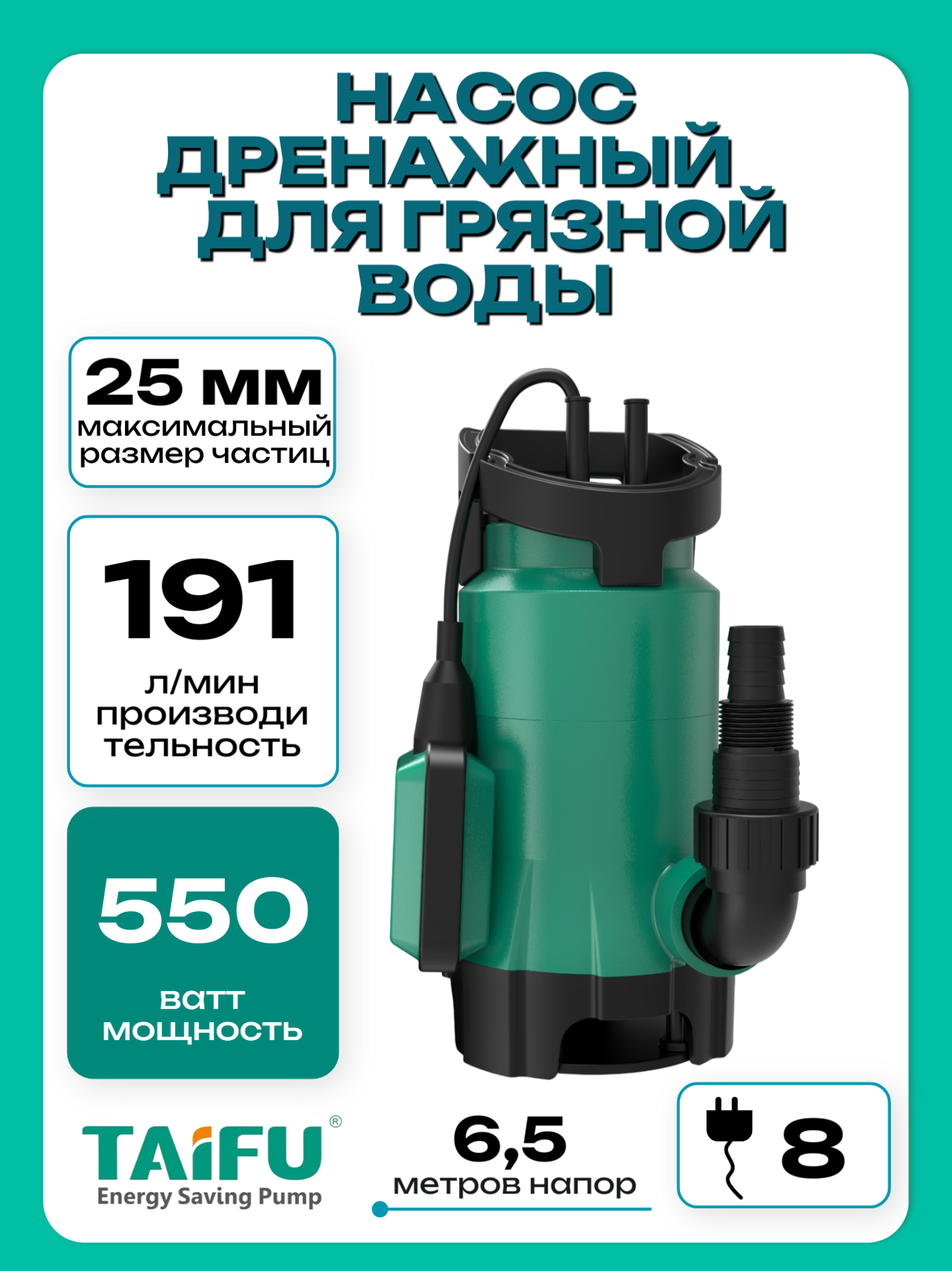 Насос дренажный для грязной воды TAIFU GS550N (Обмотка двигателя медь,частицы до 25мм, 550Вт, 191л/мин,напор 6,5м, с поплавком и кабелем 8м с вилкой)Пропускная способность 25мм. Корпус и рабочее колесо пластик. Обмотка двигателя медь. Встроенная термозащита. С поплавковым выключателем. Гарантия 1 год.Область применения:Откачка воды из подвалов, резервуаров, емкостейАвтоматика:Поплавковый выключательДренажный насос для грязной воды TAIFU GS550N - это надежное решение для быстрой откачки и удаления загрязненной воды. Он идеально подходит для использования в дачных участках, на строительных площадках или в помещениях, подверженных затоплению. Этот насос обладает высокой производительностью, обеспечивая откачку до 191 литров в минуту, что позволяет эффективно справляться с большими объемами жидкости.С максимальным напором до 6,5 метров, TAIFU GS550N легко справляется с подъемом воды на необходимые высоты, что делает его универсальным инструментом для различных задач. Устройство способно работать с частицами размером до 25 мм, что позволяет оперативно удалять не только жидкость, но и мелкие загрязнения.Наличие поплавкового выключателя добавляет удобства в эксплуатации, автоматически включая и отключая насос в зависимости от уровня воды. Это обеспечивает долгосрочную эффективность работы и предотвращает перегрев устройства.Данная модель оснащена мощным мотором мощностью 550 Вт, что гарантирует стабильную работу и минимальные затраты электроэнергии. Дренажный насос TAIFU GS550N является отличным выбором для тех, кто ценит надежность и качество в своей работе.С его помощью вы сможете легко и быстро решать задачи удаления воды в любых условиях, сохраняя ваш участок и помещение в идеальном состоянии. Если вам нужен мощный и эффективный дренажный насос для грязной воды, TAIFU GS550N станет вашим надежным помощником.