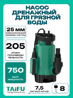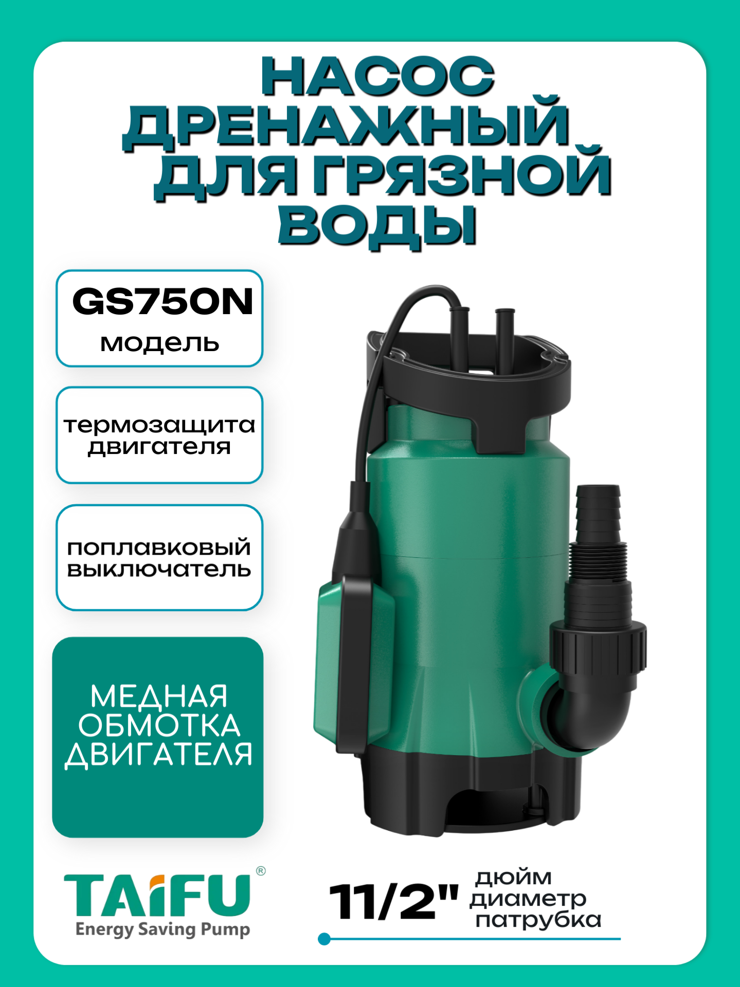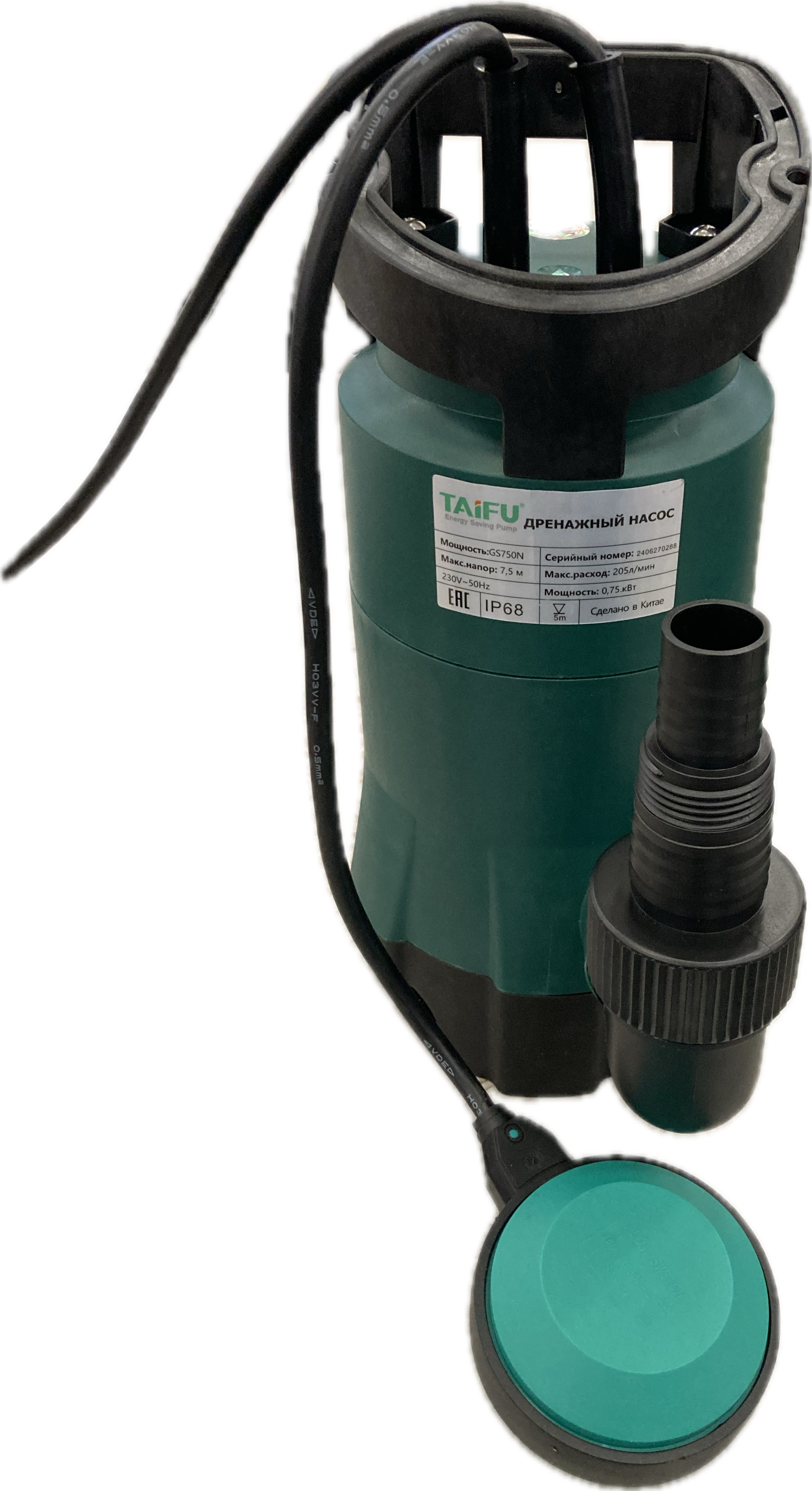 Насос дренажный для грязной воды TAIFU GS750N (Обмотка двигателя медь,частицы до 25мм, 750Вт, 205л/мин,напор 7,5м, с поплавком и кабелем с вилкой)