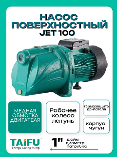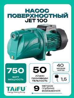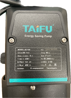 Насос поверхностный TAIFU JET100Поверхностный центробежный одноступенчатый самовсасывающий моноблочный насос серии JET для бытового холодного водоснабжения и повышения давления.Область примененияхолодное водоснабжение, полив и перекачивание чистых вод из скважин и колодцевПреимущества:Обмотка двигателя медьАнтикоррозийное покрытие рабочей камеры.Встроенная термозащита двигателя (защищает от перегрева при заклинивании или скачках напряжения).Поддержание давления 1-2 точек водоснабжения.Защита от перегрева (заработает после охлаждения через 30-40 минут).Длина кабеля 1 метрХарактеристикиАвтоматика НетПроизводительность, м3/час 3Бренд TAIFUСтрана производства КНРМодель JET80Класс энергоэффективности ВМаксимальная мощность, Вт 750Максимальный расход Q, л/мин 50Максимальный напор H, м 40Параметры электросети, В/Гц220/50Диаметр подключения, дюйм1"x1"Температура перекачиваемой среды при длительной эксплуатации, град.не более 40Температура окружающей среды, град не более 40Материал корпуса Чугун/АлюминийМатериал крыльчатки ЛатуньМатериал обмотки МедьМатериал вала Нержавеющая стальКласс защиты IP54Класс изоляции F(+180°C)Гарантия1 годДлина кабеля1 М