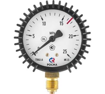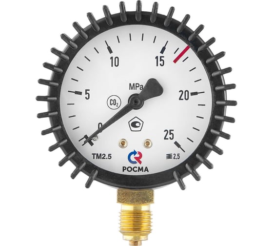 Сварочный манометр для измерений показаний давления углекислого газа от 0 до 25,0 МПа. Класс точности манометра – 2,5. Корпус манометра выполнен из стали, а механизм из латуни.