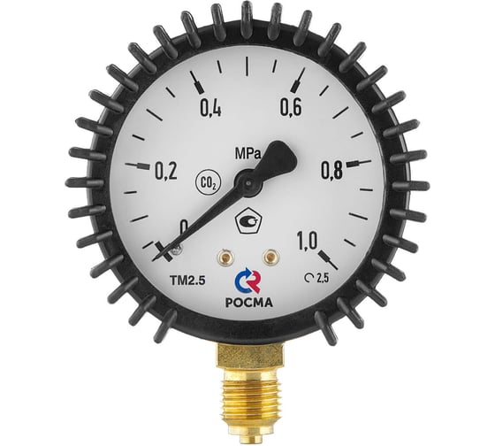 Манометр с дюймовой цилиндрической резьбой G1/4, что обеспечивает высокую прочность и герметичность соединения манометра с корпусом редуктора или регулятора для углекислого газа. Совместим с редукторами серии У-30-КР-И.