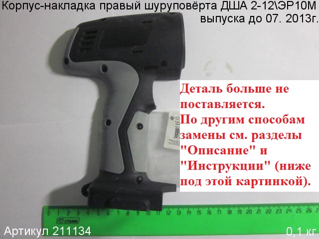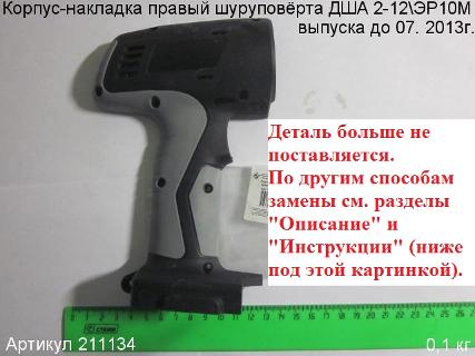 Деталей 211133 и 211134 в наличии нет и поставок больше не будет. Эта модель шуруповёрта была модернизирована. Но выход есть. Нужно немного доработать накладки 211132 и 211135 или редуктор 211327. Пошаговое руководство по замене корпусных деталей см. в разделе "Инструкции". Первый вариант более быстрый, второй – более надёжный.