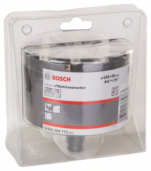 Пильная коронка 105 мм Multi Construction с креплением Power Change Bosch 2608584771 изготовлена из биметаллического сплава с лазерной сваркой, зубья HSS с 8% содержанием кобальта и прогрессивным расположением.