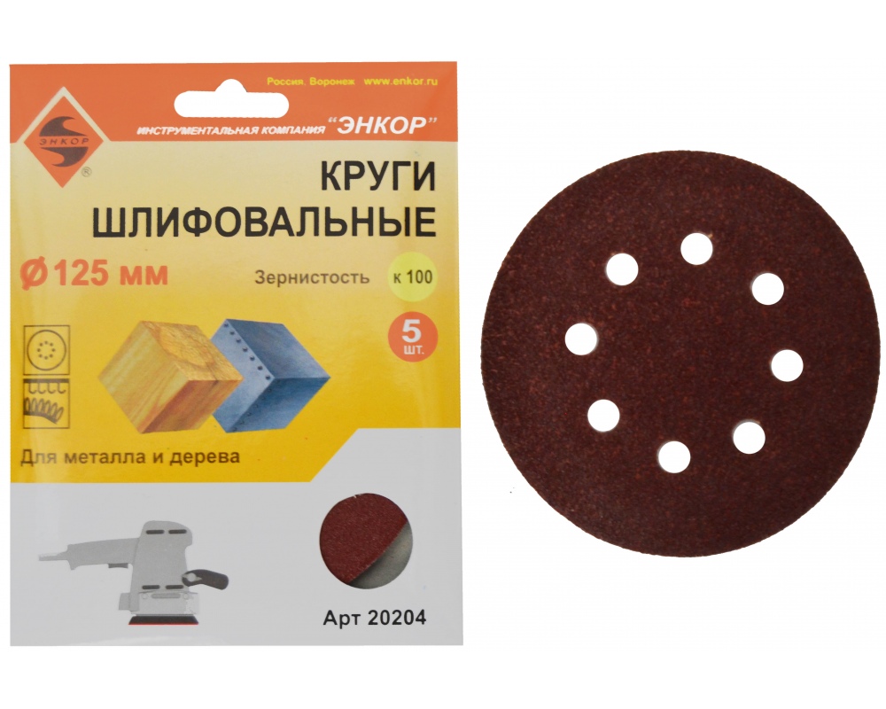 • Шлифкруг Энкор 20204 используется в эксцентриковых шлифовальных машинах ЭНКОР, BOSCH, DEWALT, Black&Decker, AEG, ELU, FESTOOL, HITACHI, KRESS, MAKITA, METABO, SKIL, FIEN.