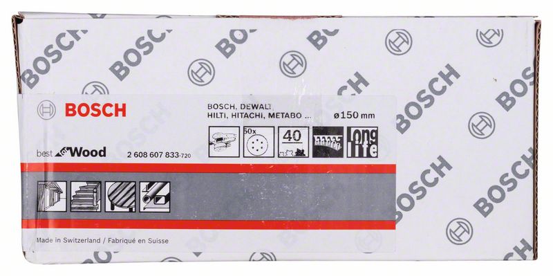Шлифкруг Ø 150 на липучке 6 отверстий для дерева, металла k40 1шт/50 (2 608 607 833)