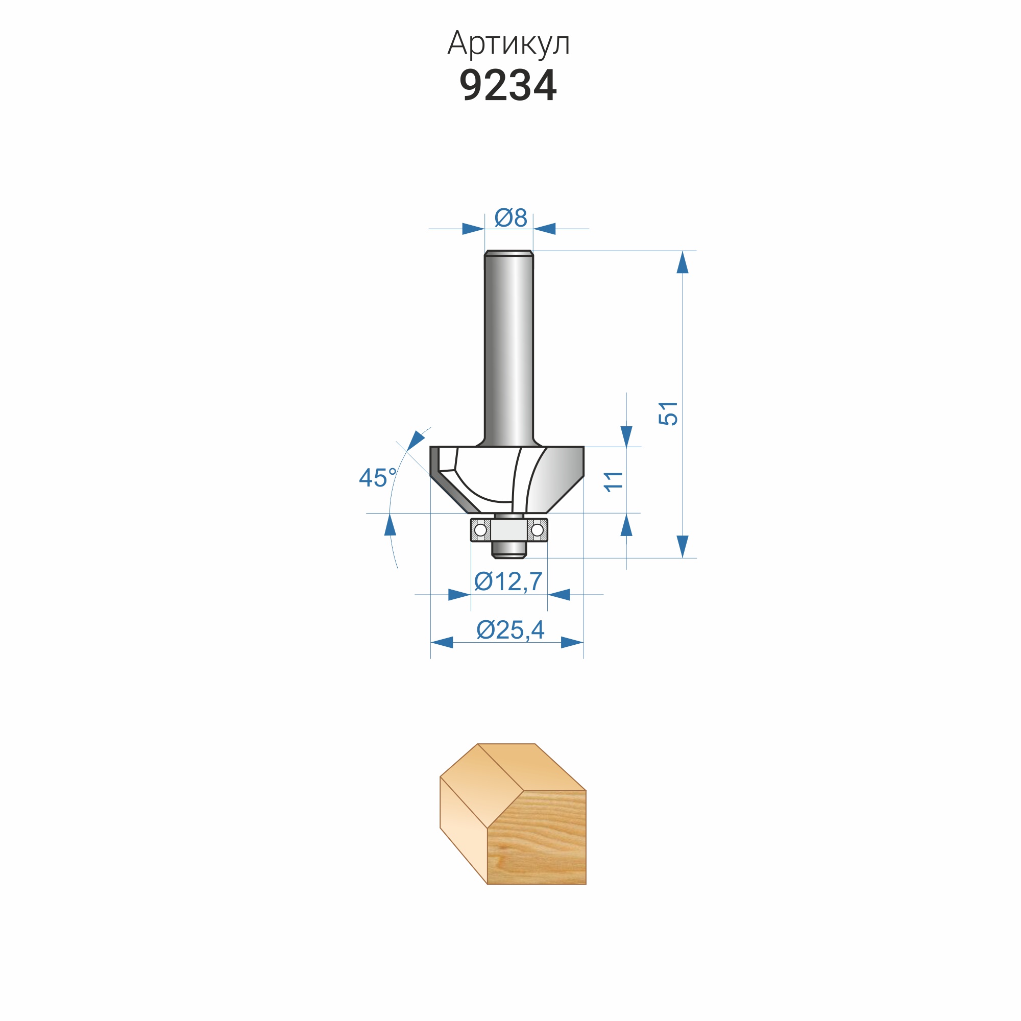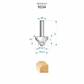 Фреза Энкор 9234 предназначена для выполнения фаски на кромках столярных изделий и декоративной обработки кромок столешниц, элементов корпусной мебели.