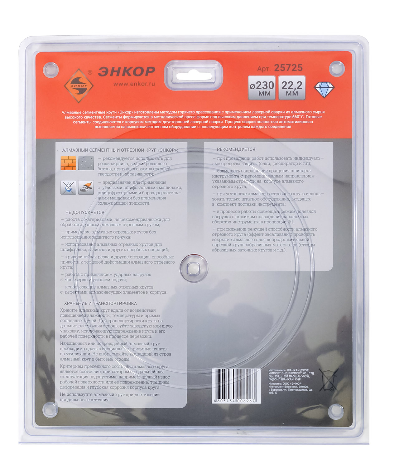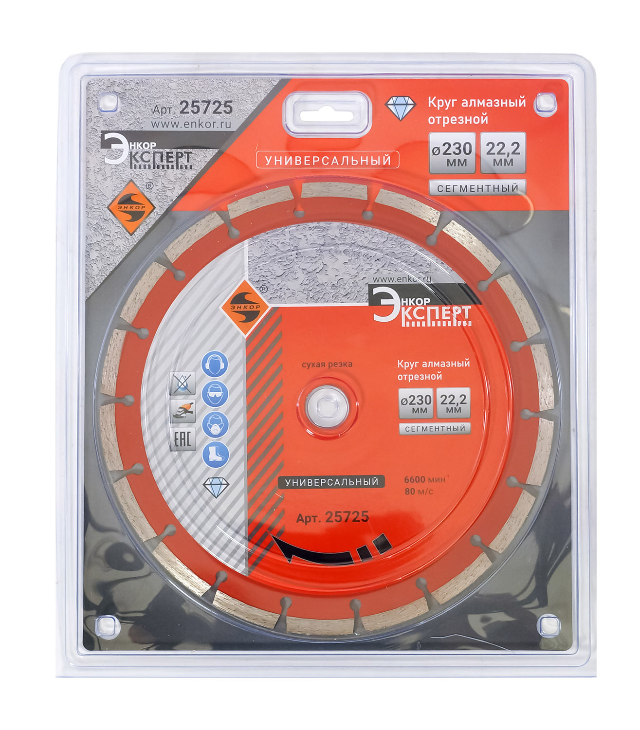 • Алмазный сегментированный круг Энкор 25725 предназначен для использования в угловых шлифмашинах без применения охлаждающей жидкости.