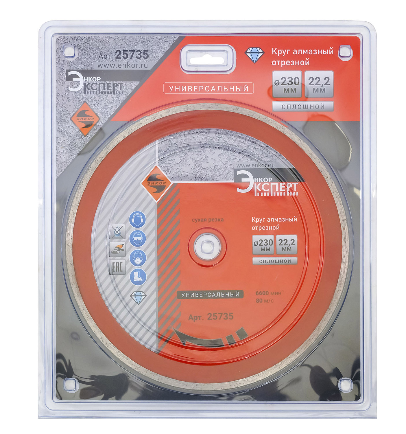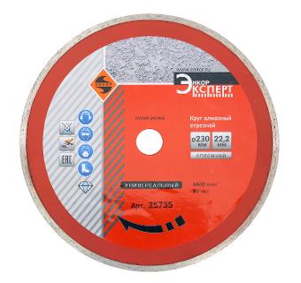 Алмазные отрезные круги со сплошной режущей кромкой Энкор - Эксперт, изготовлены по технологии холодного прессования из алмазного сырья самого высокого качества. Качество алмазной смеси определяется однородностью форм и размеров искусственных кристаллов, их величиной и наличием примесей. Методика формирования режущей кромки из алмазосодержащей смеси высоким давлением, непосредственно на корпусе круга с последующим спеканием, широко применяется при изготовлении подобных изделий. Качество и цена конечного продукта определяется здесь правильным подбором состава материала связки, качеством алмазов и чётко выдержанным технологическим процессом.