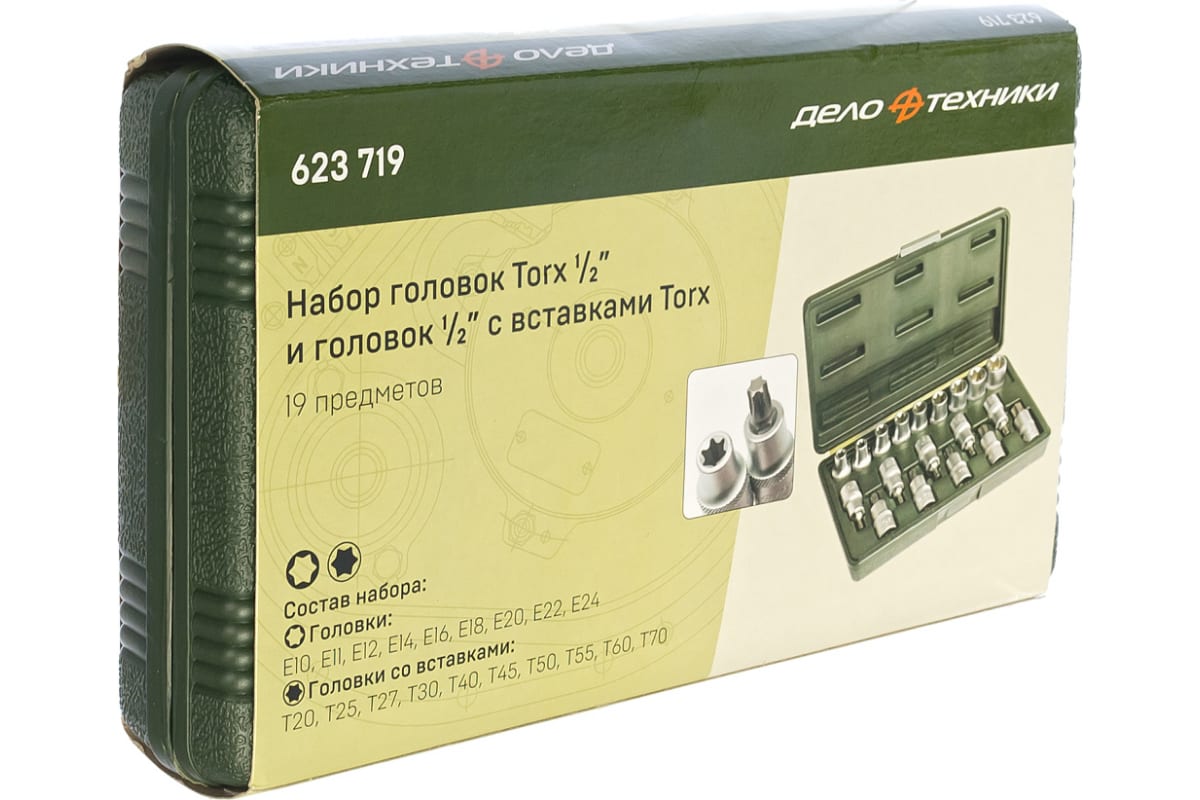 Набор головок TORX и головок со вставкой TORX 1/2 19 предметов Дело Техники 623719 - это многофункциональный комплект для работы с различными соединениями с шлицем TORX.