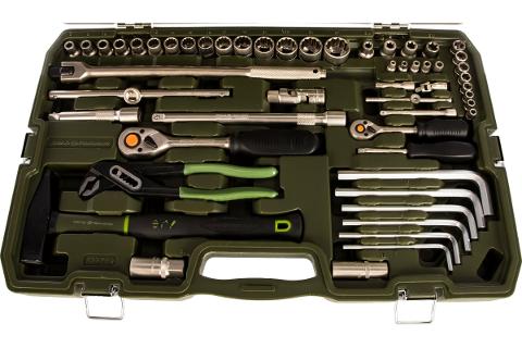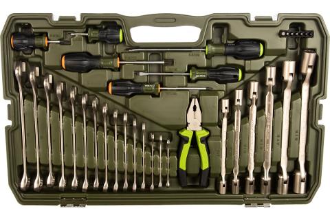 В состав входят шарнирно-губцевый, ударный инструмент, ключи и головки для работы с резьбовыми соединениями.