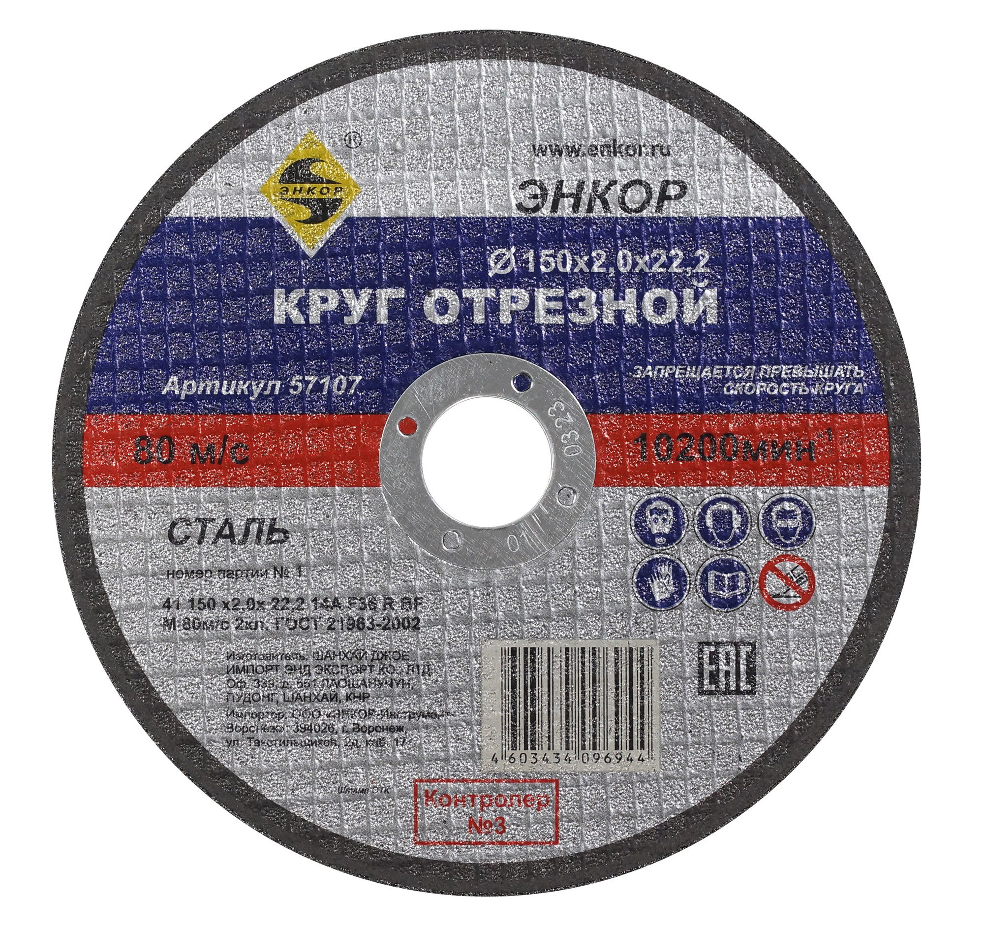 • Отрезной круг Энкор 57107 используется в угловых шлифовальных машинах для обработки металла.