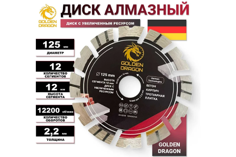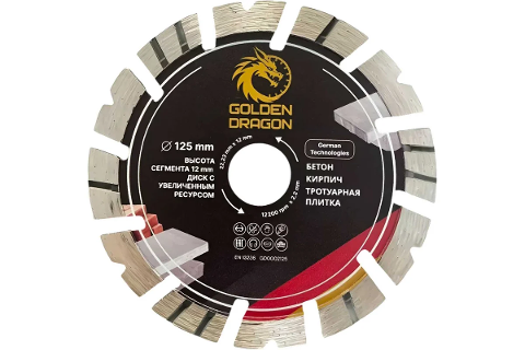 Алмазный диск по бетону GOLDEN DRAGON: высокий ресурс, производительность и эффективность. Специальная форма сегмента нашего алмазного диска с высотой 12 мм увеличивает скорость резки бетона, кирпича, газобетона, камня, мрамора, гранита, плитки и других материалов. Вы сможете добиться идеального результата без лишних усилий и значительно сократить время работы.