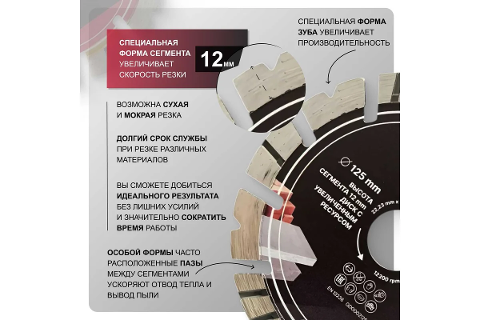 Высокий ресурс, производительность и универсальность. Благодаря специальной форме сегмента наш алмазный диск обеспечивает высокую скорость работы и долгий срок службы при резке различных материалов. Он станет вашим надёжным помощником как при строительстве, так и при ремонте.