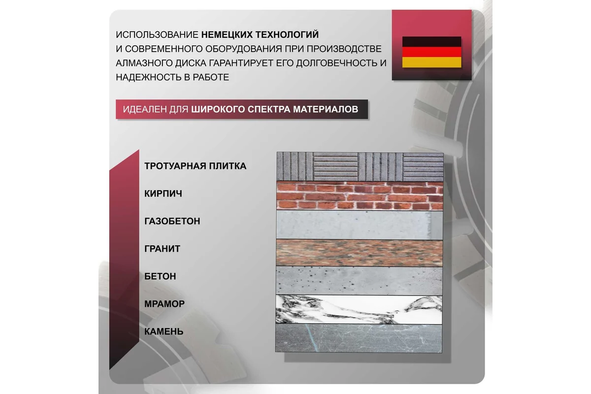 Немецкие технологии для вашего удобства. Специальный состав режущего сегмента разработан немецкими инженерами технологами. Диск изготовлен на одном из самых современных производств в Китае с использованием оборудования из США, Германии и Китая. Всё это обеспечивает высокую надежность и эффективность, и позволяет получить оптимальное соотношение цены и качества.