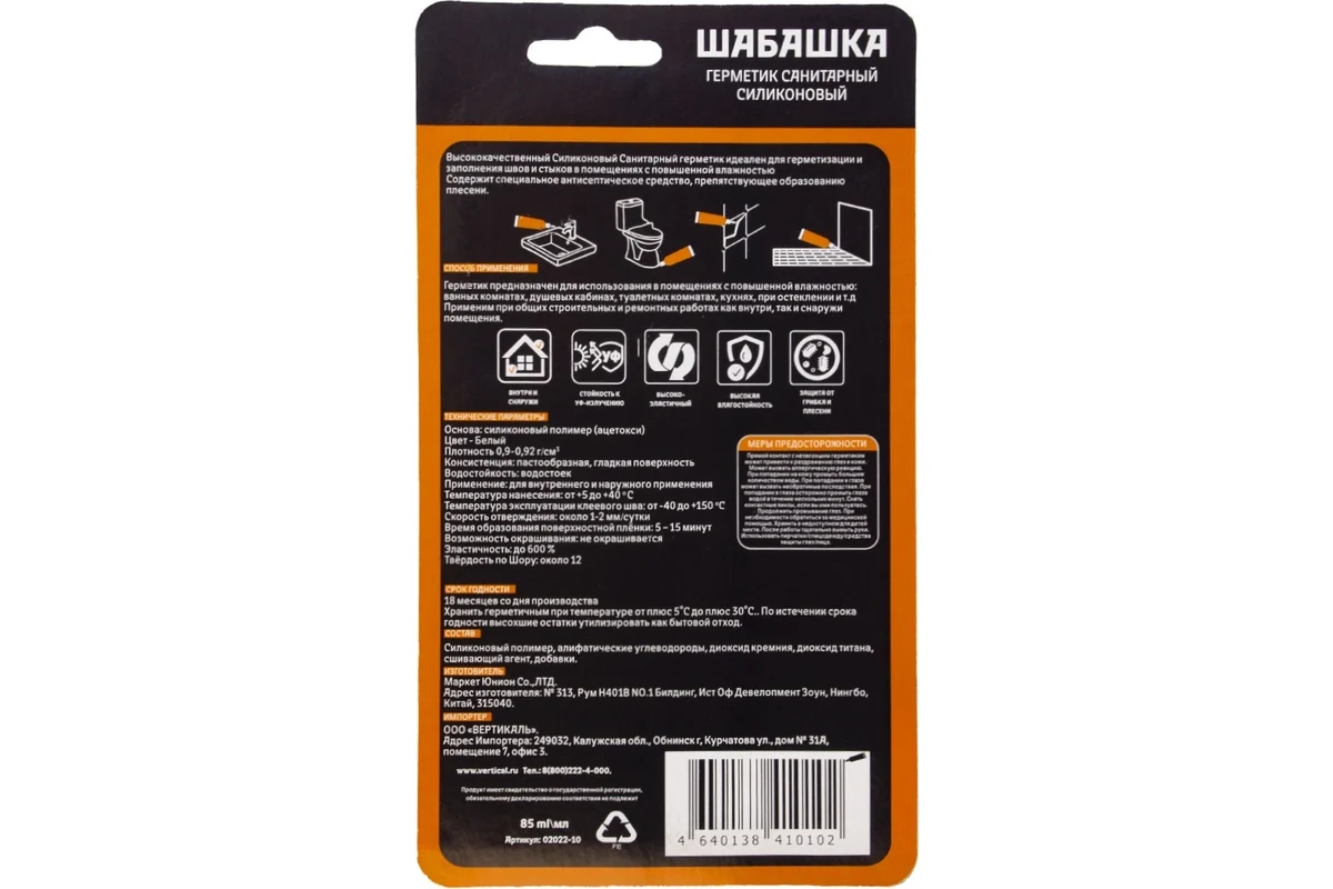Предназначен для использования в помещениях с повышенной влажностью: ванных комнатах, душевых кабинах, туалетных комнатах, кухнях, при остеклении и т.д Применим при общих строительных и ремонтных работах как внутри, так и снаружи помещения. Объем: 85 мл; Цвет: белый; Система отверждения: ацетатная; Плотность: 0,9 - 0,92 г/см³; Температура нанесения: от +5 до +40 °С; Время образования пленки: 5 - 15 минут; Скорость отверждения: 1 мм/1 день; Твёрдость по Шору: 12 А; Модуль упругости при 100% удлинении: 0,2 MПa; Удлинение при разрыве: 600%; Температура эксплуатации: от - 40 до + 150 °С; Срок годности: 18 месяцев с даты изготовления. Белый