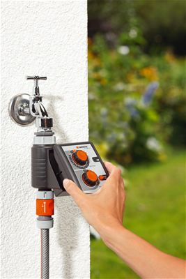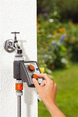 Таймер подачи воды T 1030 plus GARDENA крепится к водопроводному крану и осуществляет автоматическое управление устройствами для полива Вашего сада, например, дождевателями, такой системой микрокапельного полива, как Micro-Drip-System, или системой дождевания GARDENA. Предусмотрена возможность удобного программирования времени полива: для удобства программирования функциональный блок можно снять. Необходимые данные легко задаются с помощью двух больших удобных вращающихся регуляторов. Ежедневно пользователь может выбирать до трех поливочных циклов продолжительностью 1-120 мин каждый. Для сокращения расхода воды к таймеру могут быть подключены датчик дождя или датчик влажности почвы GARDENA. Для работы таймера требуется одна щелочная батарейка 9В (не входит в комплект поставки). Такой батарейки хватает примерно на один год работы устройства. Встроенная индикация заряда батарейки позволяет своевременно менять её по мере необходимости.