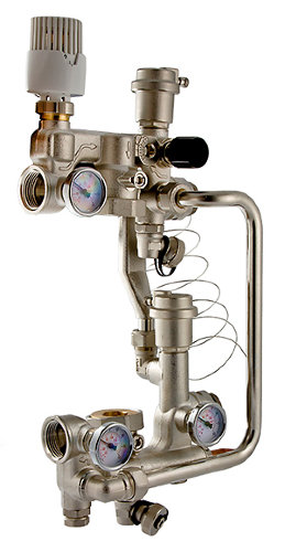 Другие основные элементы узла: байпас с перепускным клапаном; встроенные шаровые краны для отключения циркуляционного насоса; автоматический воздухоотводчик; погружные термометры.