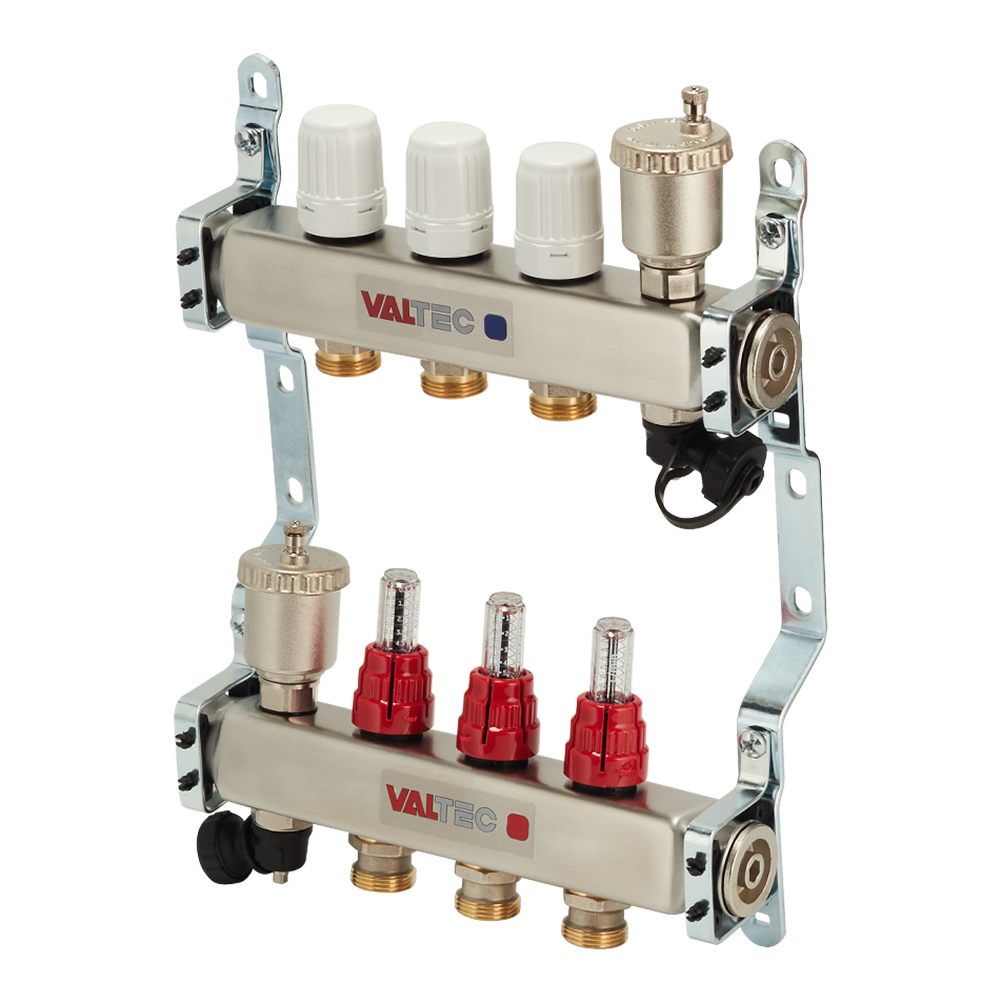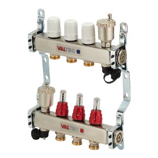 • Коллекторный блок для систем водяного радиаторного и напольного отопления (водяной теплый пол) с регулировочными (настроечными) и ручными (с возможностью установки электротермического сервопривода) запорными клапанами, автоматическими воздухоотводчиками и дренажем.