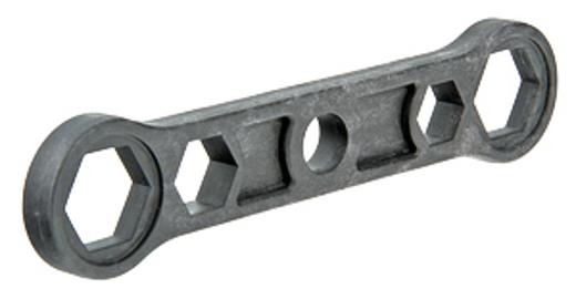 Ключ для пробок, переходников (футорок) и воздухоотводчиков секционных алюминиевых и биметаллических радиаторов. Выполнен из нейлона. Использование этого инструмента исключает механическое повреждение финишного покрытия указанных изделий. Размеры фитингов и воздухоотводчиков "под ключ" – 42, 32, 22 мм.