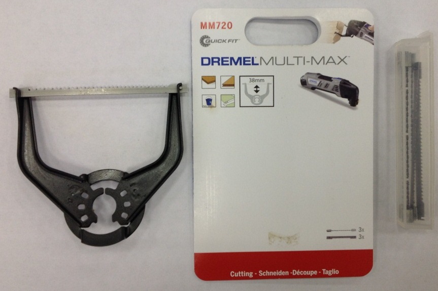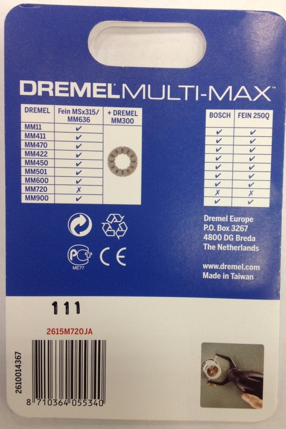 С помощью этой рамки крепятся полотнаMM722 (2 615 M72 2JA, 2.615.M72.2JA) иMM721 (2 615 M72 1JA, 2.615.M72.1JA). К табличке с возможностями применения с инструментами различных производителей надо относиться с осторожностью. Например, немецкие коллеги убедились, что Dremel MM720 не садится так просто с помощью адаптера MM300 на FEIN Multimaster FMM250Q. Зато после уменьшения диаметра кольца с 31 мм до 23,5 мм адаптер MM300 позволяет устанавливать насадки Dremelне только нана FEIN Multimaster FMM250Q, но и, в некоторых случаях,наMakita BTM50 Multitool.