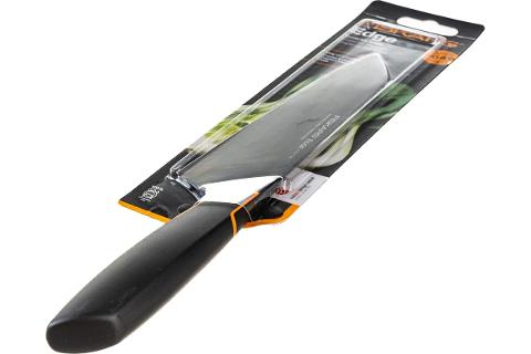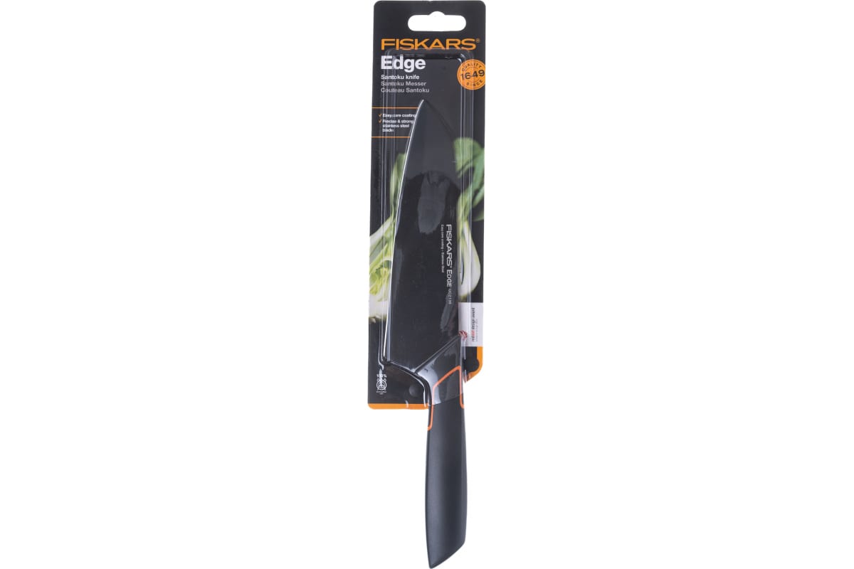 • Нож Fiskars "Сантоку" Edge 1003097 подходит для мяса, рыбы и овощей. Выполнен из нержавеющей японской стали. Имеет твердость 53 по шкале Роквела.