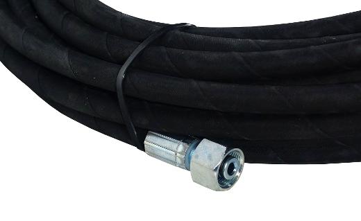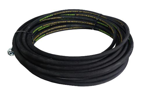 Рукава высокого давления предназначены для применения в качестве гибких соединительных трубопроводов в гидросистемах строительных, дорожных, сельскохозяйственных, лесных, коммунальных и др. мобильных и стационарных машин для подачи под высоким давлением рабочих жидкостей. Шланги образца 2SN выполнены из маслостойкой резины, усилены двумя слоями металлической оплетки и покрыты снаружи слоем синтетической резины, стойкой к истиранию.Благодаря армировке способны выдерживать большое давление и могут использоваться с профессиональными аппаратами высокого давления. Фитинги на концах шланга - гайки DKF-W с метрической резьбой М22*1,5 мм.Длина шланга 25 метров.Внутренний диаметр шланга (DN) - 8 ммНаружный диаметр шланга - 16,6 мм