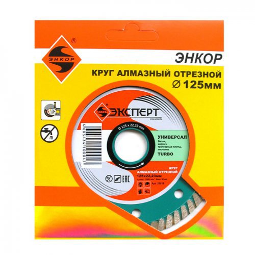 Алмазные отрезные круги Энкор - Эксперт турбо, изготовлены по технологии холодного прессования из алмазного сырья самого высокого качества. Качество алмазной смеси определяется однородностью форм и размеров искусственных кристаллов, их величиной и наличием примесей. Методика формирования режущей кромки из алмазосодержащей смеси высоким давлением, непосредственно на корпусе круга с последующим спеканием, широко применяется при изготовлении подобных изделий. Качество и цена конечного продукта определяется здесь правильным подбором состава материала связки, качеством алмазов и чётко выдержанным технологическим процессом.
