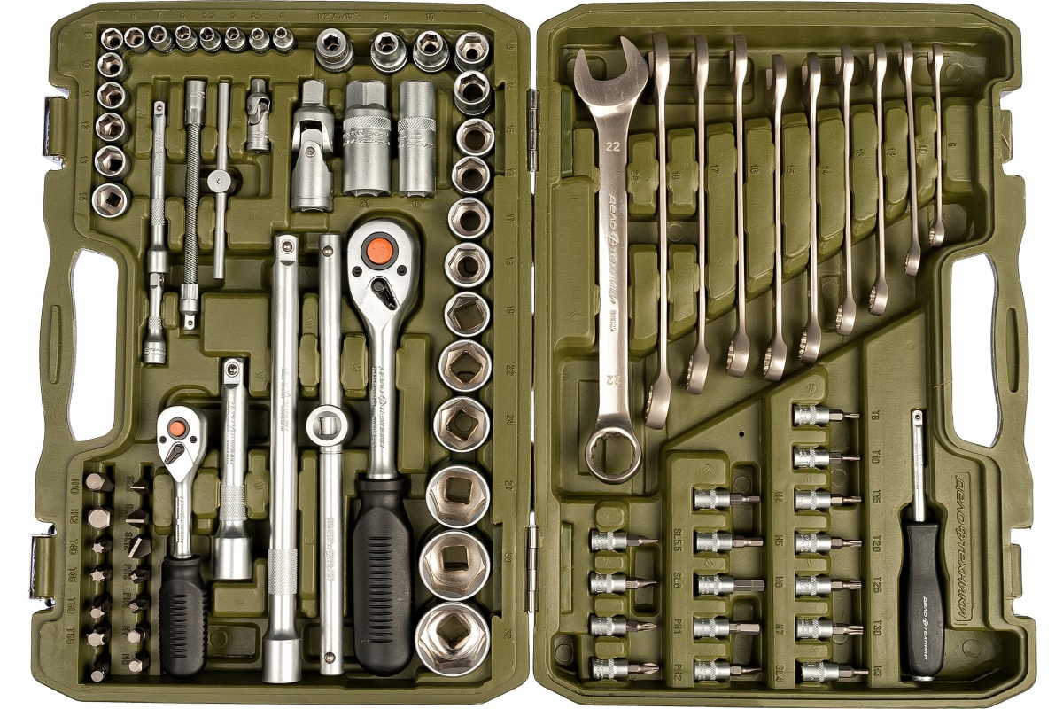 • Включает ключи, переходники, трещотки и головки различных размеров.