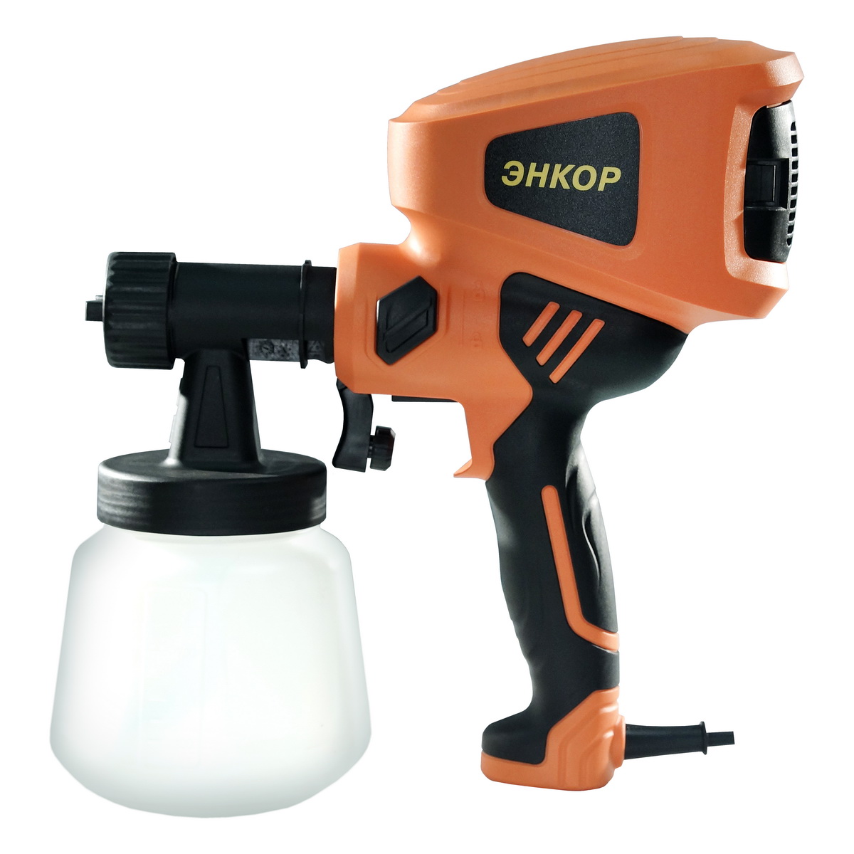 • Краскораспылитель Энкор КЭ-400 50336 со встроенным компрессором имеет бачок для краски объемом 0.9 л, что обеспечивает продолжительный рабочий цикл.