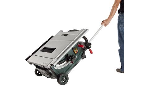 • Дисковая настольная пила с ножками и колесами Metabo TS 216 600667000 монтируется на складной поставке, что делает хранение простым и удобным.