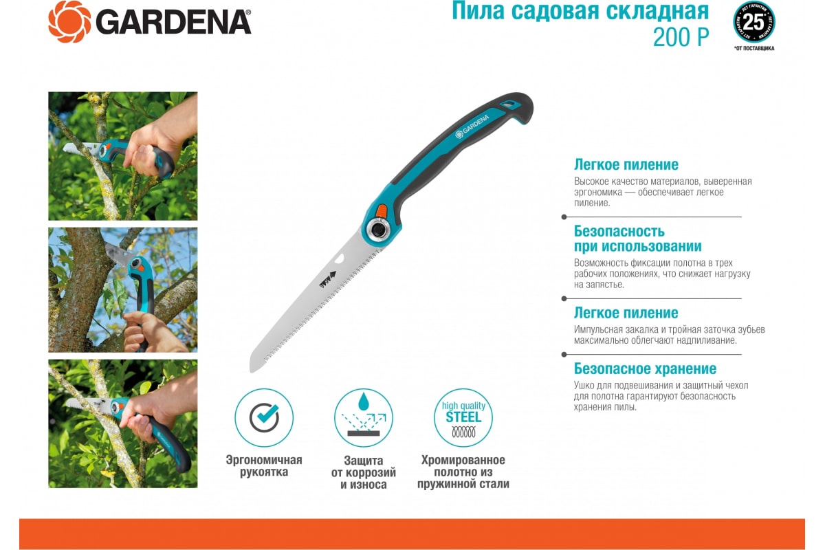 • Садовая складная пила 200 P Gardena 08743-20.000.00 применяется для работы на садовом участке, подравнивания кроны и отпиливания веток деревьев.