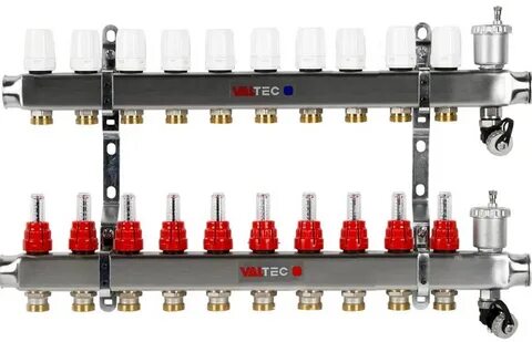 • Выходы подающего коллектора укомплектованы ручными регулировочными клапанами с расходомерами, обратного – ручными запорными клапанами, на которые можно установить электротермические сервоприводы.