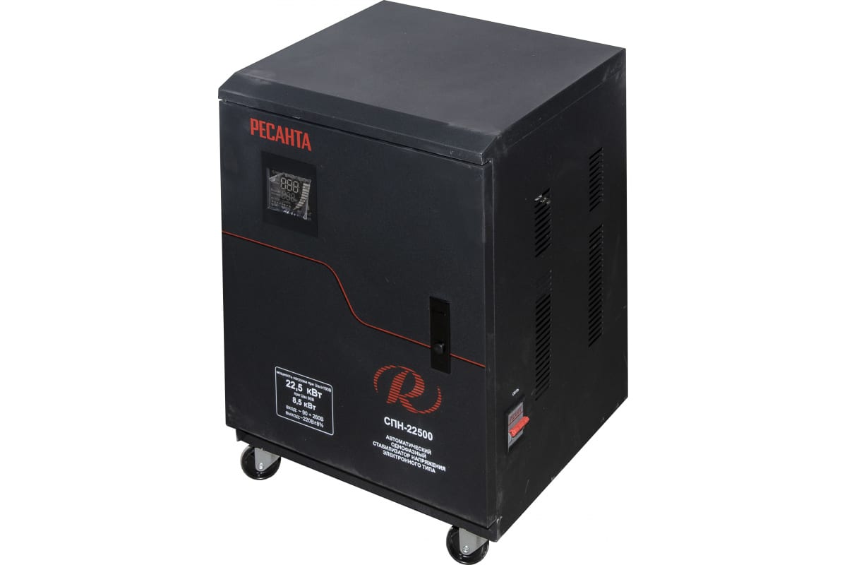Стабилизатор напряжения Ресанта СПН-22500 способен защитить от перепадов напряжения в сети оборудование и бытовые приборы суммарной мощностью до 22,5 кВт. Этого внушительного объема будет достаточно для обеспечения бесперебойной работы бытовых приборов хорошо оснащенного электроникой дома, небольшой производственной линии, а также высокоточного оборудования.