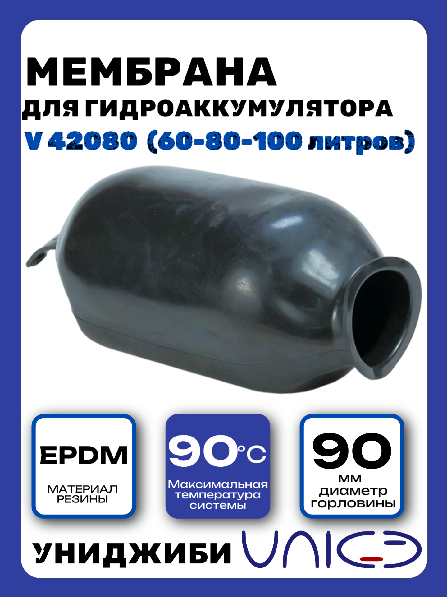 Мембрана VAREM Униджиби для гидроаккумулятора 60-80-100 л ( V42080 ) ( 90/115/600 мм )Мембрана VAREM Униджиби для гидроаккумулятора 60-80-100 л ( V42080 ) ( 90/115/600 мм ) подходит для вертикальных и горизонтальных баков Varem-Униджиби. Мембрана для гидроаккумулятора VAREM Униджиби для гидроаккумулятора 60-80-100 л проходная - это важный компонент системы водоснабжения, обеспечивающий равномерное распределение и сохранение давления в системе. Мембрана служит для разделения сред воздуха и воды в баках. Мембрана изготовлена из прочного и надежного материала EPDM (синтетическая этилен/пропиленовая эластичная резина), допущенного для работы с питьевой водой. На этапе производства вводятся специальные добавки, повышающие эластичность мембраны, прочность на разрыв, стойкость к старению материала, тем самым увеличивается срок службы изделия. Таким образом, изделия из данного материала обладают высокой степенью стойкости к химическим и температурным воздействиям. Это позволяет использовать мембрану в разнообразных условиях эксплуатации. Максимальное рабочее давление составляет 10 Атм, что обеспечивает безопасность и эффективность работы системы. Максимальная температура воды, с которой может работать мембрана, достигает 99 °C, что обеспечивает ее надежность и долговечность. Диаметр горловины мембраны составляет 90 мм, что обеспечивает прочное и надежное соединение с гидроаккумулятором. Мембрана подходит для баков размером от 60 до 100 литров, как вертикального, так и горизонтального исполнения, что позволяет ей эффективно работать в системах различного масштаба. Мембрана для гидробака VAREM Униджиби для гидроаккумулятора 60-80-100 л проходная - это надежный и удобный компонент, который обеспечивает равномерное распределение и сохранение давления в системе водоснабжения. Она способствует эффективной работе системы и предотвращает возможные поломки или повреждения. Подходит для установки как в гидроаккумуляторы, так и в экспансоматы. КОНСТРУКТИВНЫЕ ОСОБЕННОСТИ: Макс. рабочее давление – 10 Атм Температура перекачиваемой жидкости, С – от +0 до +99 ТЕХНИЧЕСКИЕ ХАРАКТЕРИСТИКИ: Страна бренда – Италия Производитель – Varem (ООО "Униджиби") Количество отверстий – 2 Тип – универсальная Объем, л – 60-80-100 л Размеры, мм – 90/115/600