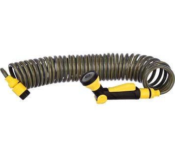 В комплект входят: спиральный шланг - 10 м; 2 коннектора (один - с функцией Aqua Stop); многофункциональный пистолет; адаптер для подсоединения к водопроводному крану G3/4; настенный кронштейн.