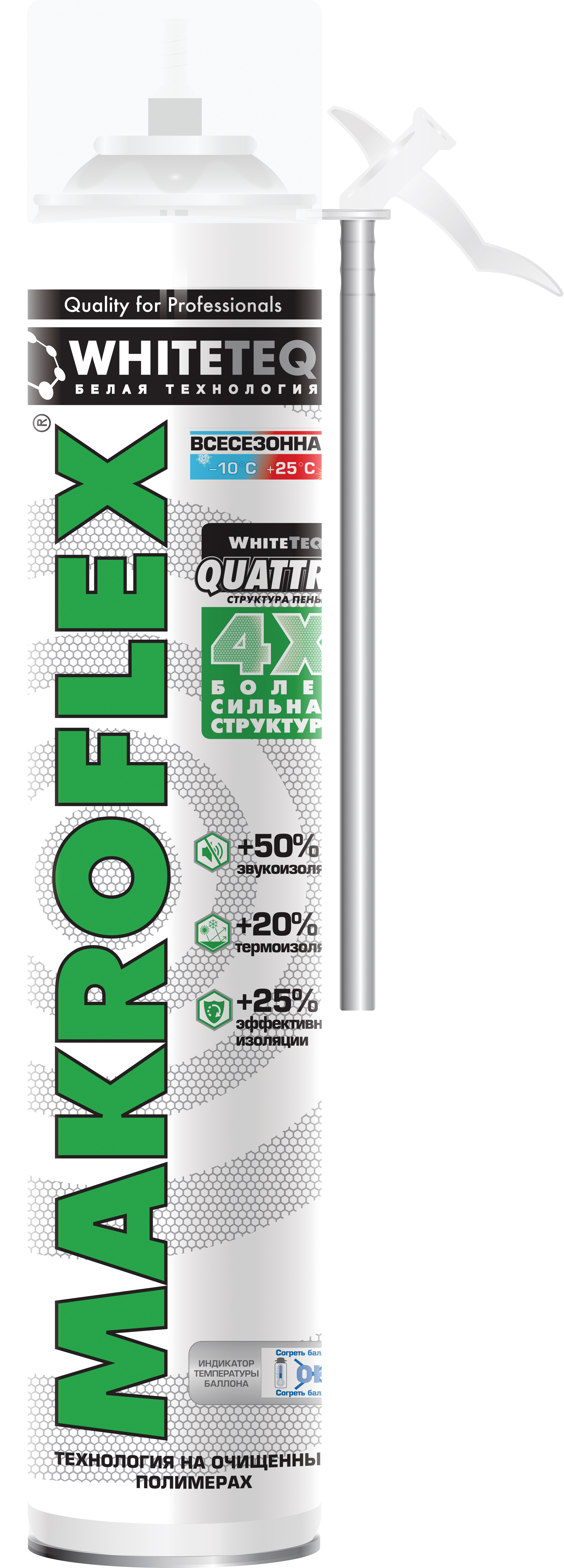 WHITETEQ Белая Технология - это новое поколение пен на основе очищенных и концентрированных полимеров, обладающих Quattro структурой. QUATTRO структура — это структура передовых материалов высокого энергосбережения. Она имеет в 4 раза больше ячеек на единицу площади, а значит в 4 раза более сильную, прочную и высокоэластичную структуру + 50% звукоизоляция. Предельное звукопоглощение 63дБ, сертификат iftRosenheim, Германия. Новый уровень звукоизоляции - высокий комфорт проживания. +20% термоизоляция. Наивысшая теплоизоляция благодаря крайне низкой теплопроводности 0,032 Вт/м*К - сокращение расходов на обогрев помещений - снижение потерь тепла. Долговечность и эффективность изоляции. Компенсация движения и вибраций внутри строительных конструкций на 25% эффективнее, благодаря Quattro структуре - Предотвращение образования трещин в шве. Сохранение изолирующей способности шва. Температура применения от -10°С до +25°С . Индикатор температуры баллона.