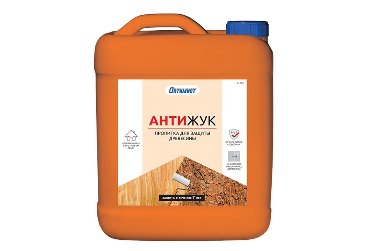 • Пропитка Оптимист Антижук для защиты древесины С415 5 л  применяется для обработки лесо- и пиломатериалов (брусьев, стропил, полов и других конструкций из древесины) с целью защиты от всех видов насекомых.